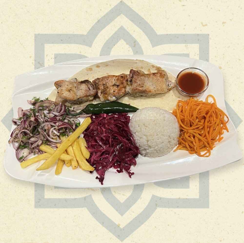 Курятина из фермера, хрустящая картошка, салат морковь, красный лук, лаваш, красная капуста, вкусный томатный соус, мамины чапати