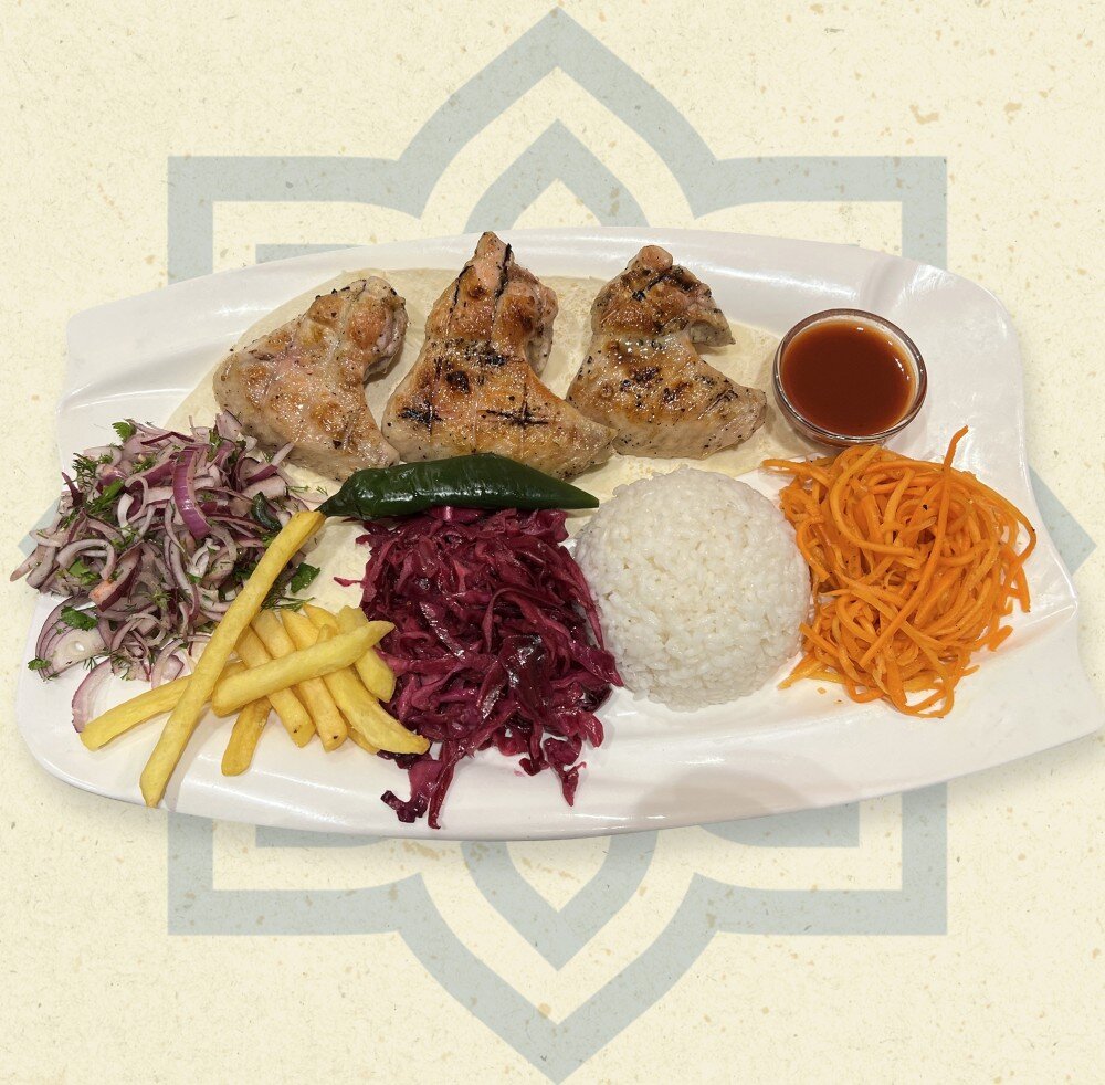 Вкусные Крылышки, хрустящая картошка, салат морковь, красный лук, лаваш, красная капуста, вкусный томатный соус, мамины чапати