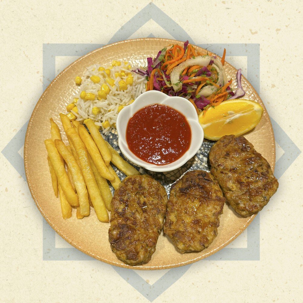 Кёфте говяжий с сыром, хрустящая картошка, салат морковь, красный лук, красная капуста, вкусный томатный соус,лимон