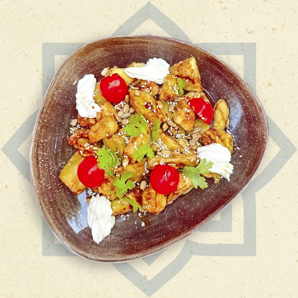 Вкусная баклажан хрустящий, арахис, фирменный соус, кунжут, помидоры чери, сметана