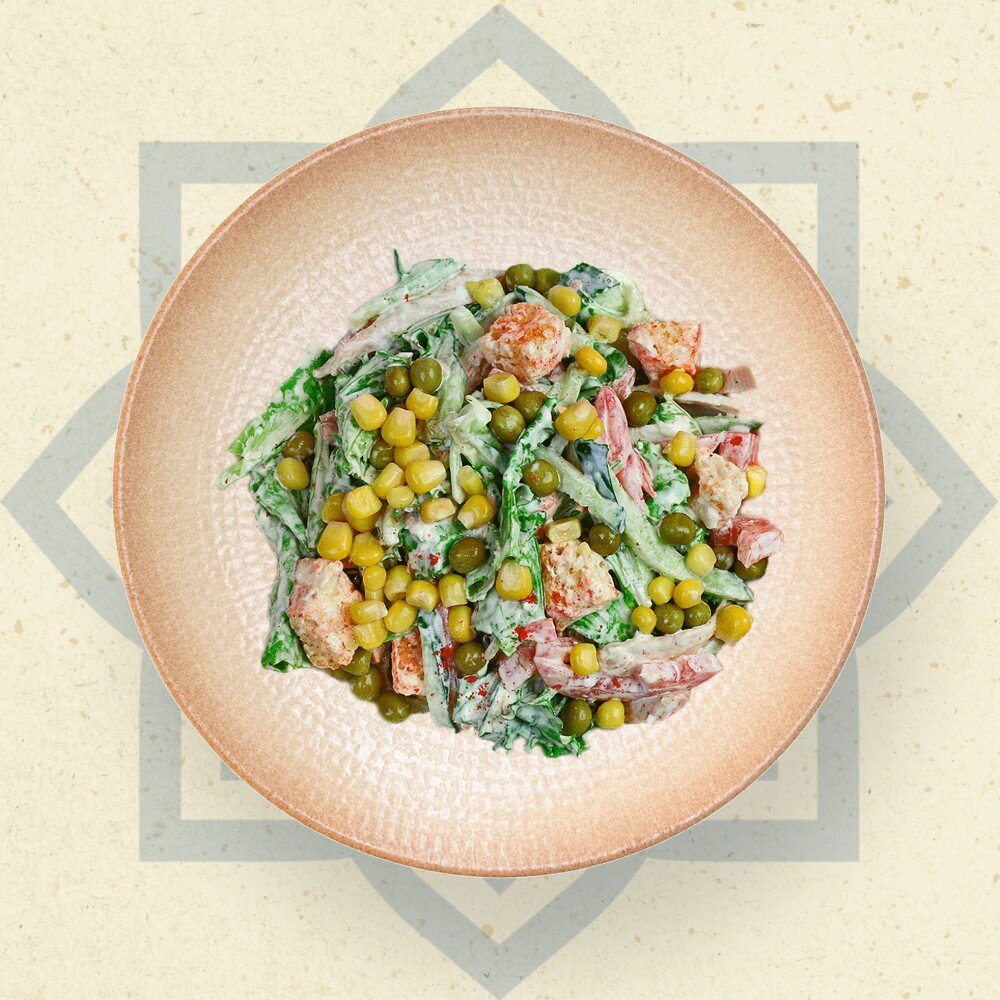 Копченная колбаса, куриный копч, мясо контр. филе,огурцы, зел. горошек, сыр пармезан, фирменный соус