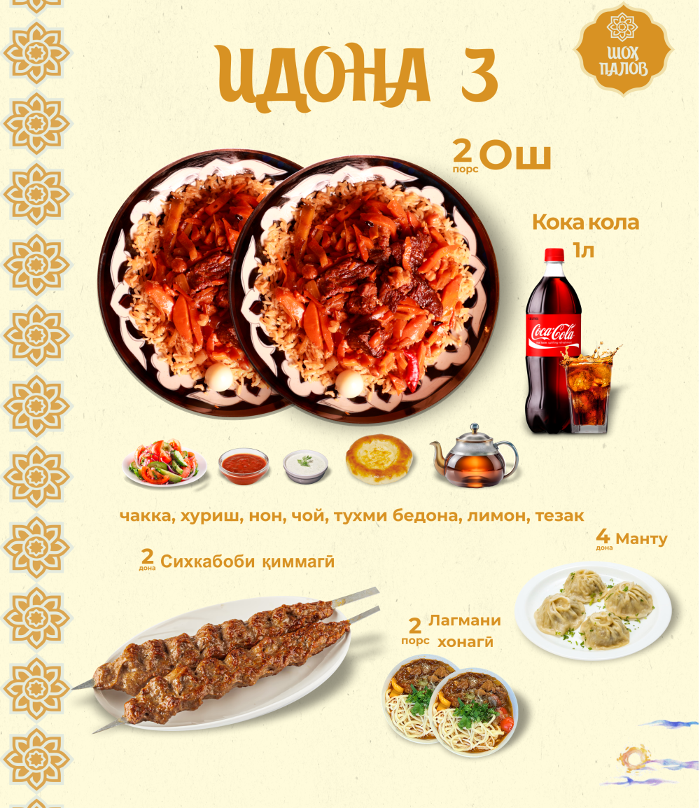 Ош стандарт-2порц Манту-4шт Шашлык фарш-2шт Лагман-2шт Кока-кола 1лт-1шт